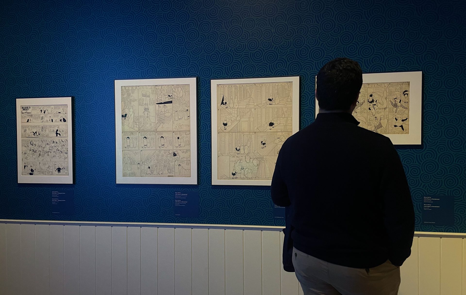 The Yellow Kid, de Richard Felton Outcault, es el comienzo. Un inicio en blanco y negro. Un arranque clásico, pero revelador: una viñeta de un niño que, con su camisón y su sonrisa descuidada, representa la pobreza neoyorquina y hace una crítica sutil al consumismo. Un poco más adelante aparece Rosie’s Beau – Bringing Up Father, cómic creado por George McManus. A través de sus bocadillos con diálogos, la historieta exhibida muestra la relación de Jiggs, el protagonista, con su mujer, Maggie.